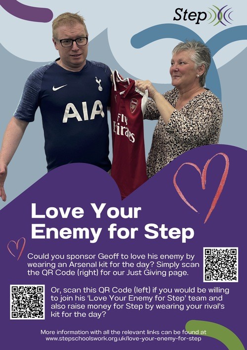 From September 2025, we are encouraging as many people as possible to 'Love Your Enemy For Step' by wearing their rival's football shirt for the day. Geoff is leading this by example as he shall put on an Arsenal shirt to raise money for Step.